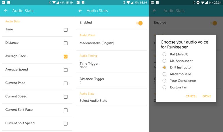 Za naprosto nezbytnou funkcionalitu považuji audiokouče. Ten v Runkeeperu rozhodně nechybí. Informace o vašem aktuálním stavu vám poskytne v nastavitelném časovém nebo vzdálenostním intervalu. Co od něj chcete slyšet, si samozřejmě vyberete podle potřeby.