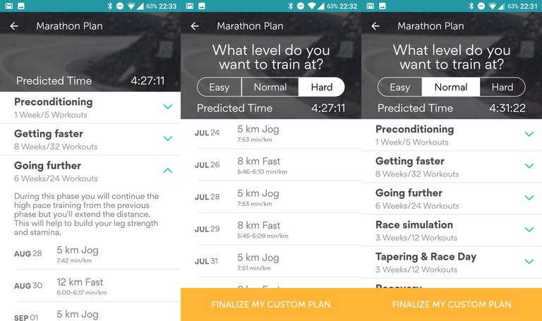 Tréninkové plány jsou prémiovou funkcionalitou. Připraví vás na vzdálenosti od 5 kilometrů po maraton, a to pro různé výkonnostní kategorie a časy. Tréninkový plán je krásně rozfázovaný a jednotlivé dny se dají v případě potřeby přizpůsobit.