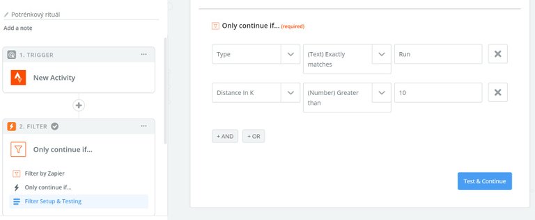 Filter – Filter stojí mezi triggerem a action. Umožňuje přeskočit některé triggery. Když to vztáhnu na náš fitness příklad, mohou se vyloučit všechny aktivity, které nejsou běhy.