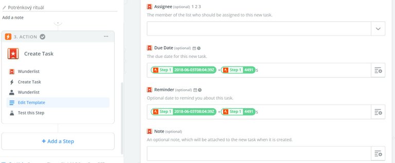 Posledním krokem bude akce - vytvoření záznamu v úkolníčku. V Zapieru je jich k dispozici několik, ale nakonec jsem byl nucen zvolit Wunderlist, protože umožňuje zvolit notifikaci na přesný čas.