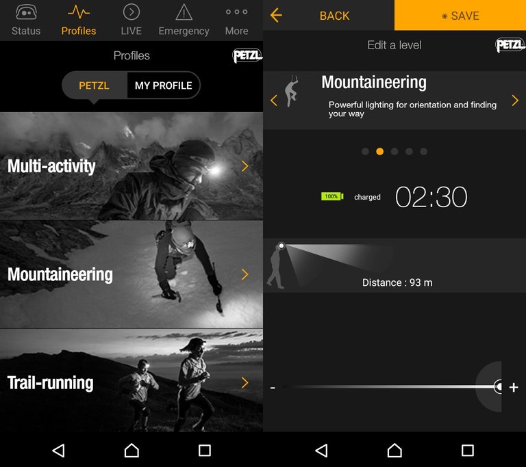Nastavení různých profilů - můžete použít ty přednastavené pro běhání, trekking, horolezectví nebo bivakování. Není problém vytvořit si vlastní. Možnosti nicméně nejsou neomezené. Nemůžete ovládat intenzitu lampy na blízko a do dálky zvlášť. Lze jen vybírat přednastavených poměrů a zvýšit či snížit intenzitu oběma lampám zároveň. Vždy vidíte, jak daleko dosvítíte a jak dlouho vydrží baterie.
