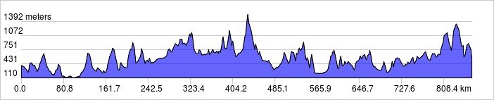 Podle Endomonda to bylo 862 kilometrů s tím, že nastoupat jsem jich musel 18. Ve výsledku tam bude ještě něco navíc, protože mi místy blbla GPS a po městech jsem zoufale hledal cykloservisy. Vyrazil jsem 5. července v 16:00 a skončil cirka 13. července v 17.40. Celkem jsem na trase strávil 193 hodin. Nicméně celková doba pohybu byla „pouze 73h“, zbytek času jsem asi někde zevloval (ve skutečnosti to bude více, ale byl jsem tak pomalý, že si GPS myslelo, že stojím).