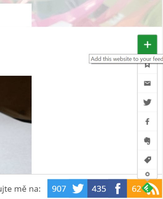 Ale výše uvedené metody jsou hrozně otravné. Já přece při každém objevu nového blogu nechci chodit na Feedly a přidávat tam nějaká URL. Pokud používáte nějaký inteligentní prohlížeč (či spíše méně hloupý než ty ostatní) jako je Chrome a Firefox, můžete si nainstalovat Feedly rozšíření: odkaz na Chrome store a odkaz na Liška store. Na každém webu se pak objeví malá, nenápadná ikonka pro rychlé přihlášení se k odběru.