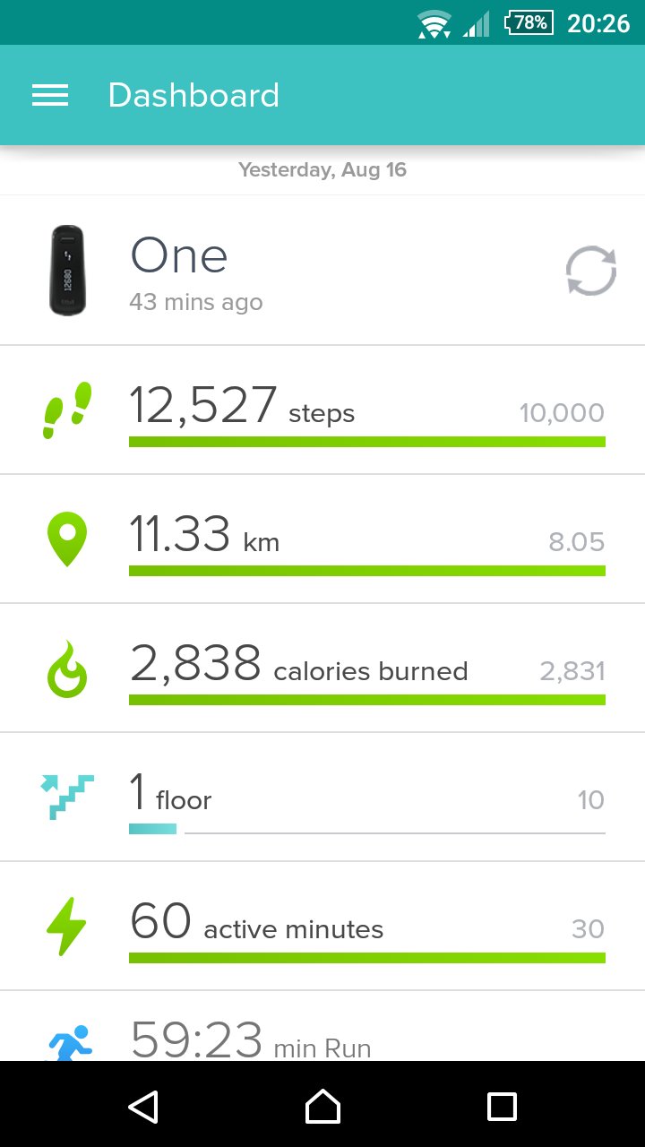 Základní funkcí Fitbitu One je měření ušlých kroků. Další zajímavou funkcí je sledování počtu vystoupaných schodů respektive pater. Nechybí ani „badges“, které za tyto aktivity dostáváte.