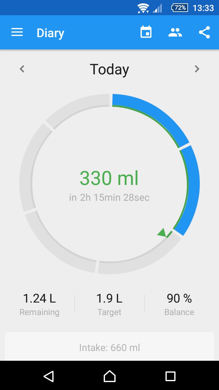 Když úspěšně vložíte své základní údaje, dostanete se do sekce Diary. Zde máte přehled především o dnešním dni (a případně se dá swipovat i do minulosti). Dole je kolik vody zbývá dnes vypít, kolik vody byste měli vypít za celý den a balance ukazuje jestli máte předpito či jste pod doporučením. Kliknutím na graf můžete zalogovat, že jste si natočili další sklínku.
