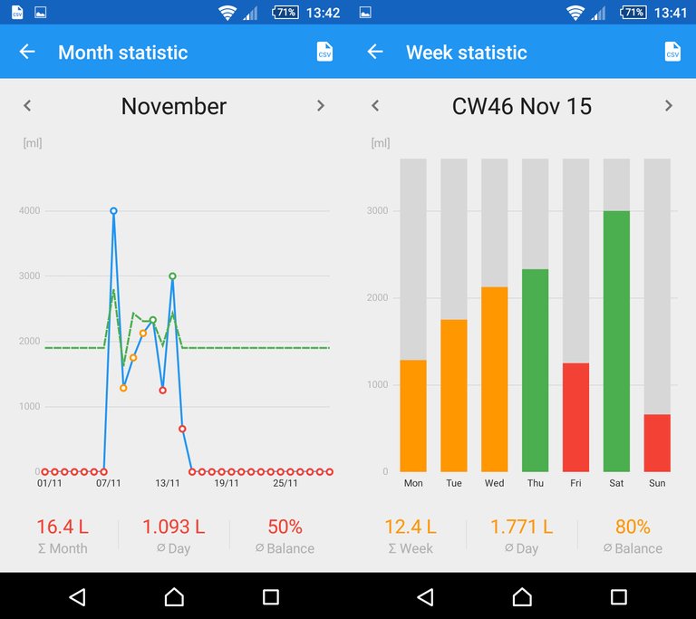 V této sekci se také dají vaše data vyexportovat do CSV souboru. V něm naleznete pro jednotlivé dny, kolik jste vypili a kolik jste měli vypít.