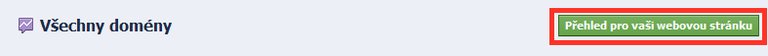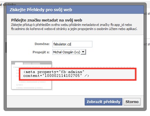 Zde klikněte na tlačítko "Přehled pro vaší webovou stránku" Vyskočí vám lightbox, kde vyplníte adresu svého webu. Aby vám Facebook uvěřil, že je váš, musíte do jeho hlavičky (mezi tagy ) vložit zvýrazněný kód.