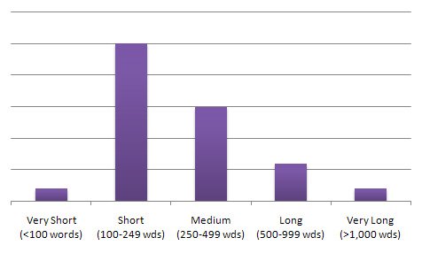 Články mezi 100-500 slovy jasně vedou a všechno ostatní už je spíše minorita. Limit pěti set slov (cca 3 tisíce znaků) byste měli překračovat jen výjimečně a pokud jste si jisti tím, co děláte. Na druhou stranu pokud napíšete sto slov a nevíte jak dál, měli byste zvážit, zda je dané téma pro článek dostatečně obsáhlé. Na krátké myšlenky tu máme sociální sítě.
