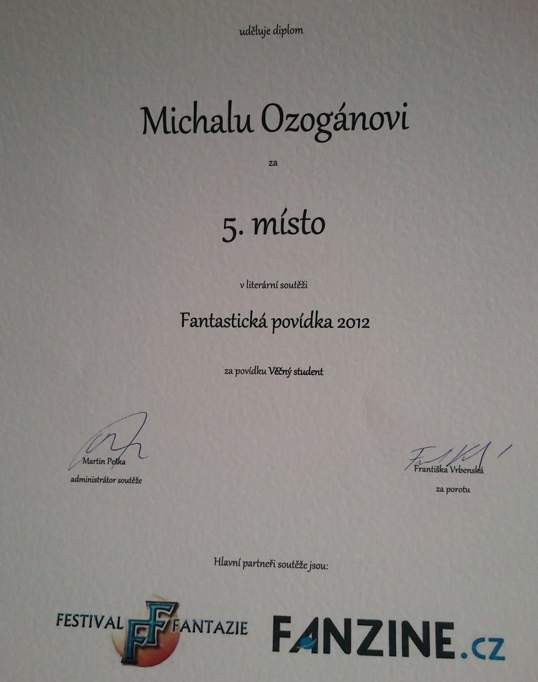 Ale jinak vše proběhlo bez újmy na zdraví. Překvapilo mě, že z Petra Stejskala se vyklubal postarší pán a přišel si pro druhé místo. Prvenství si odnesl Tomáš Řezníček. Kompletní pořadí se dozvíte na Fanzinu: fanzine.topzine.cz/vitezem-literarni-souteze-fantasticka-povidka-2012-je-tomas-reznicek